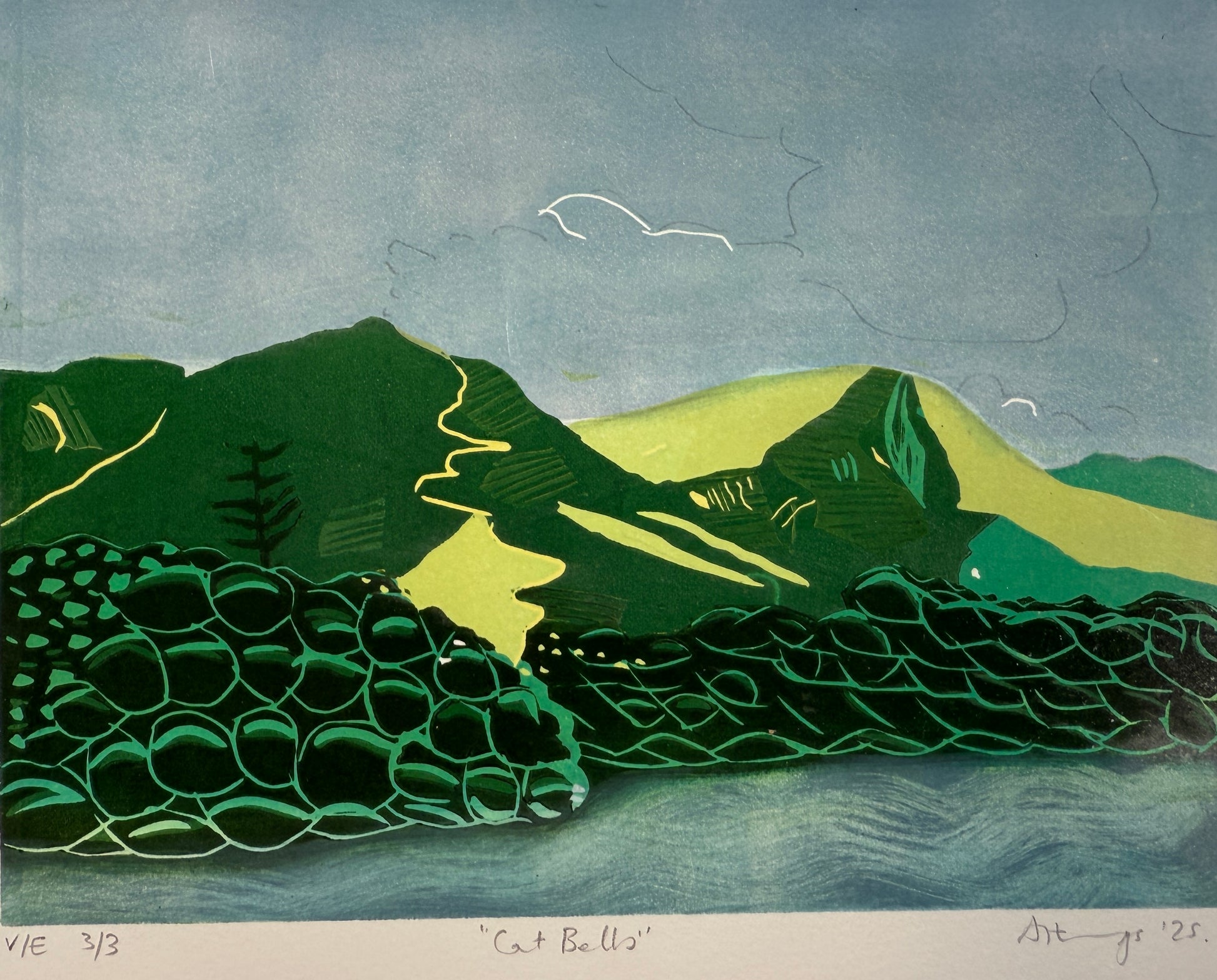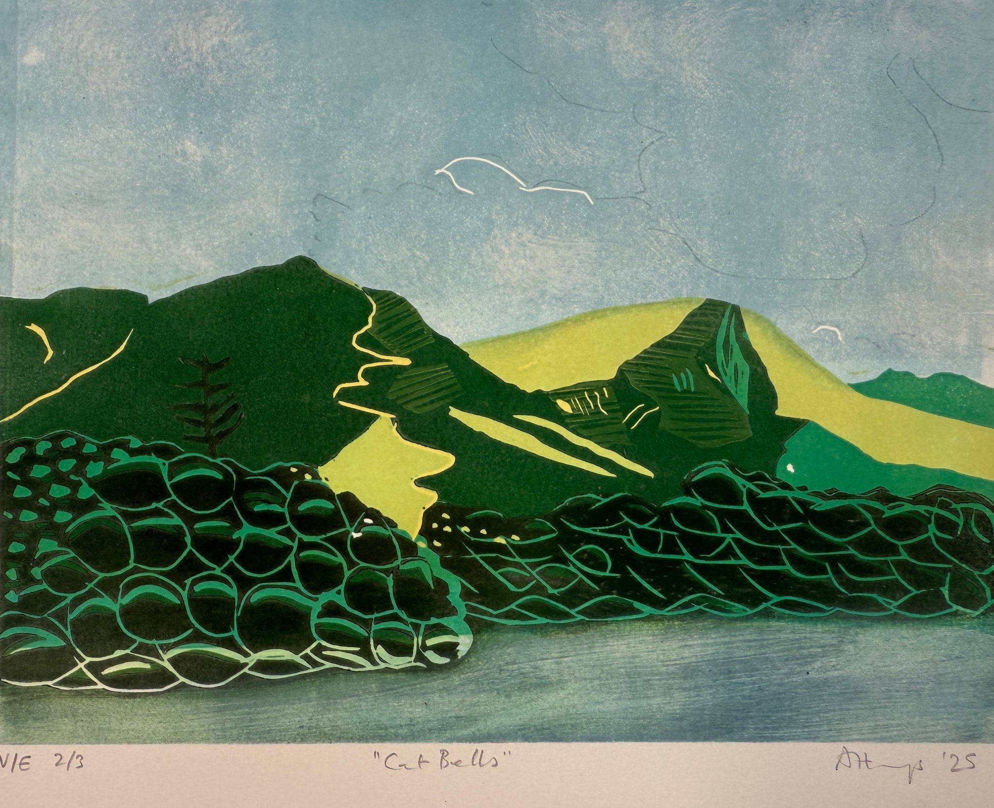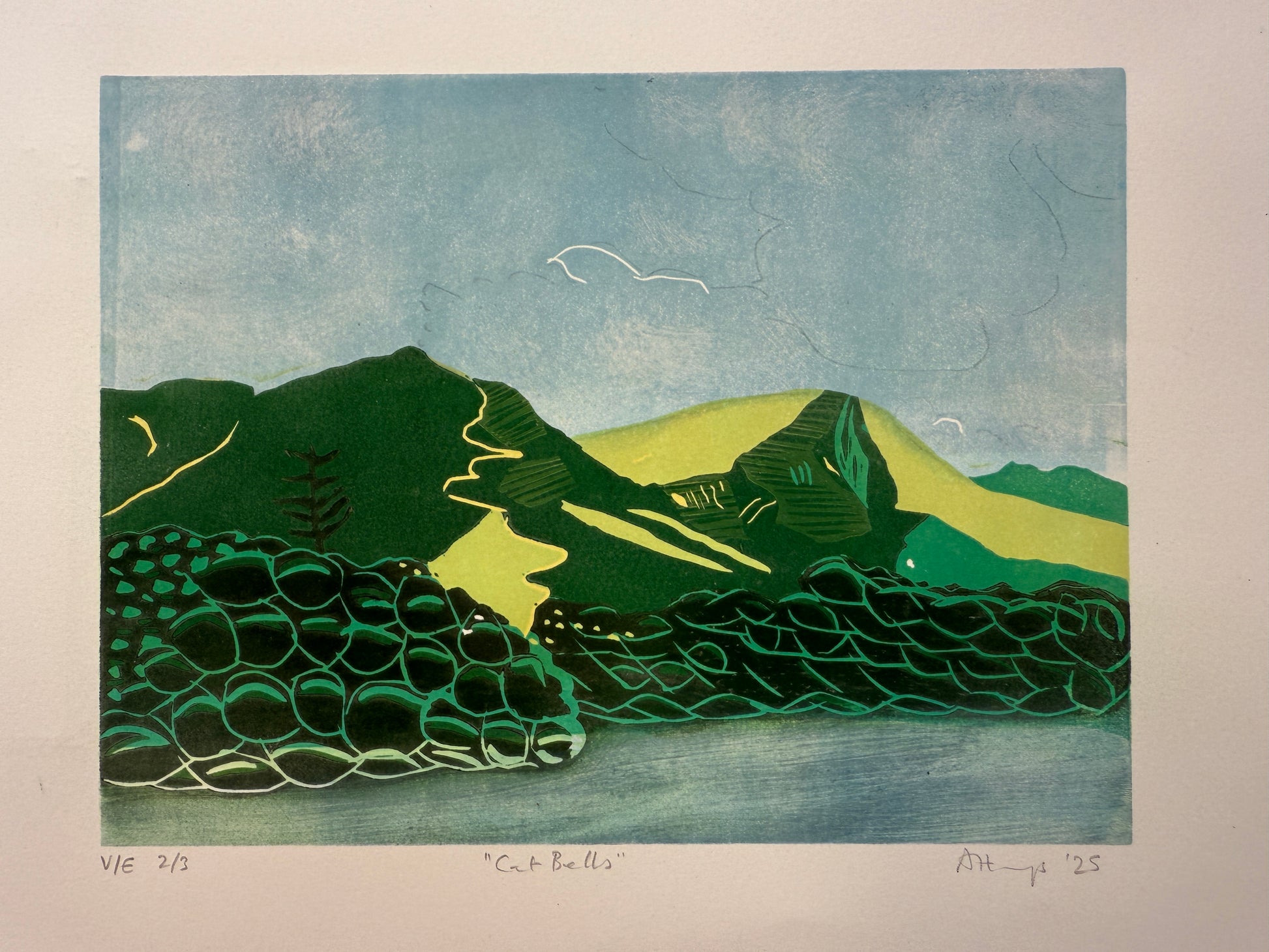 A 7 colour reduction linocut print, printed on Somerset Satin 250gsm printing archival paper.