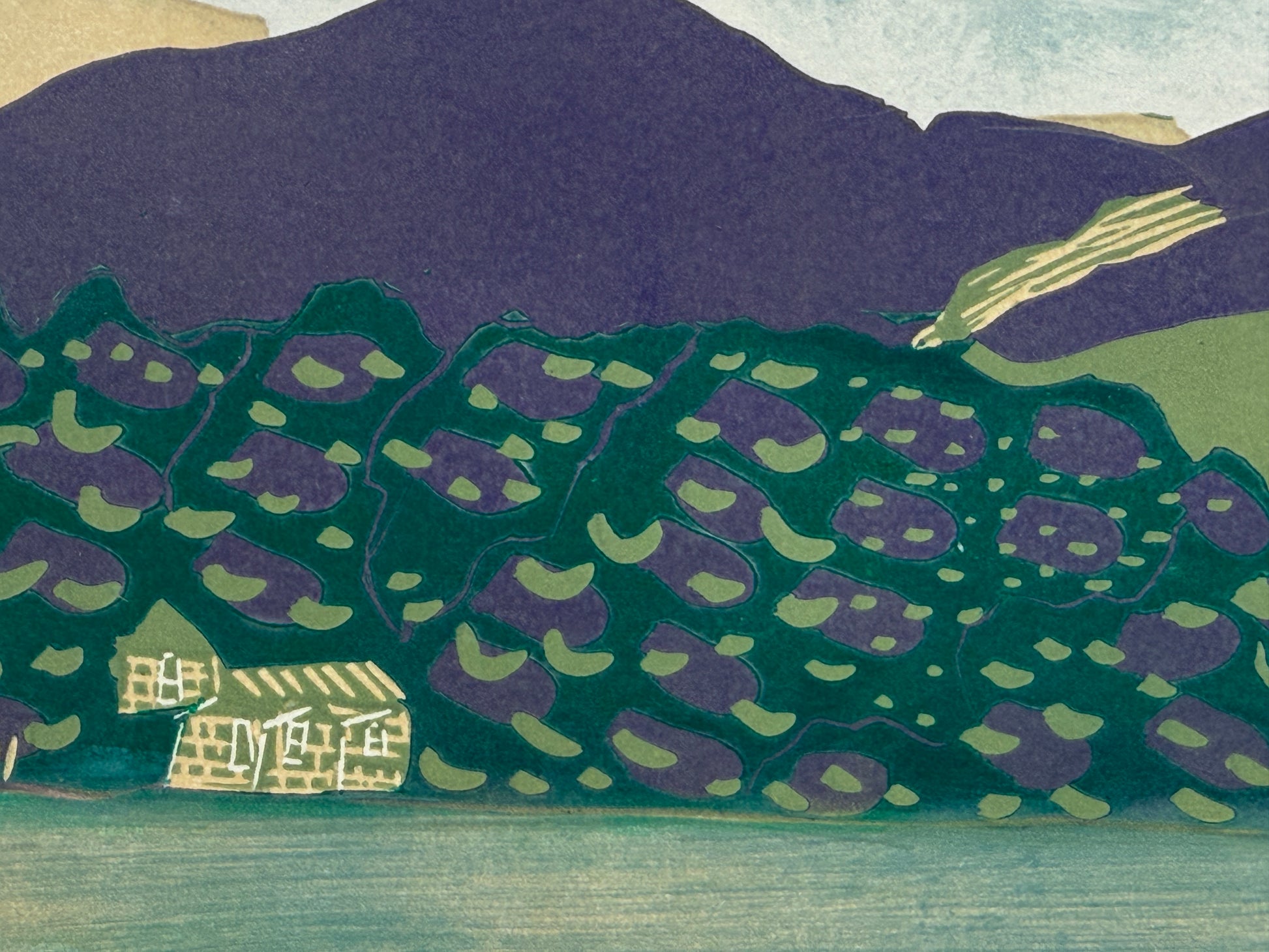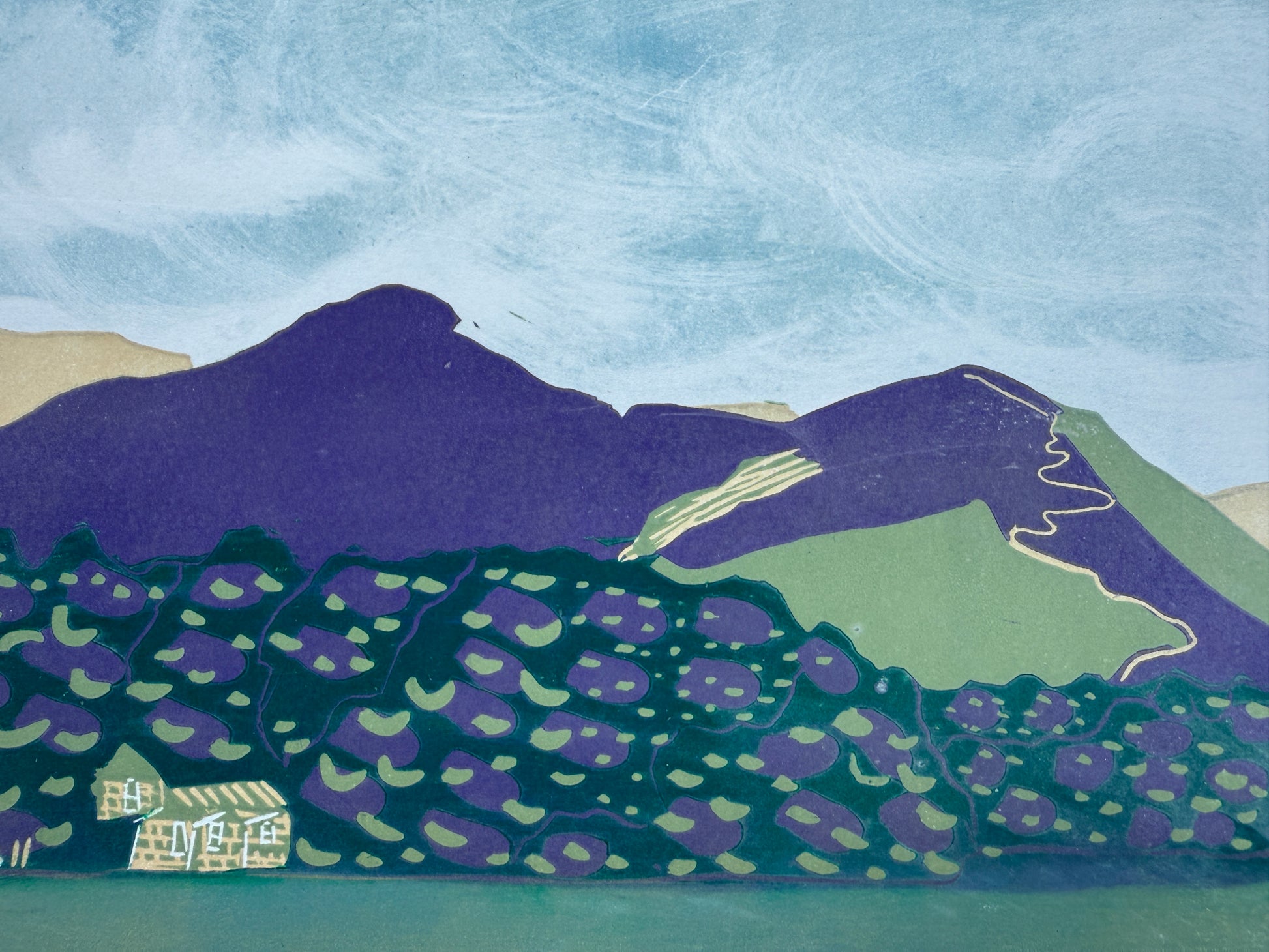A 7 colour reduction linocut print, printed on Somerset Satin 250gsm printing archival paper.