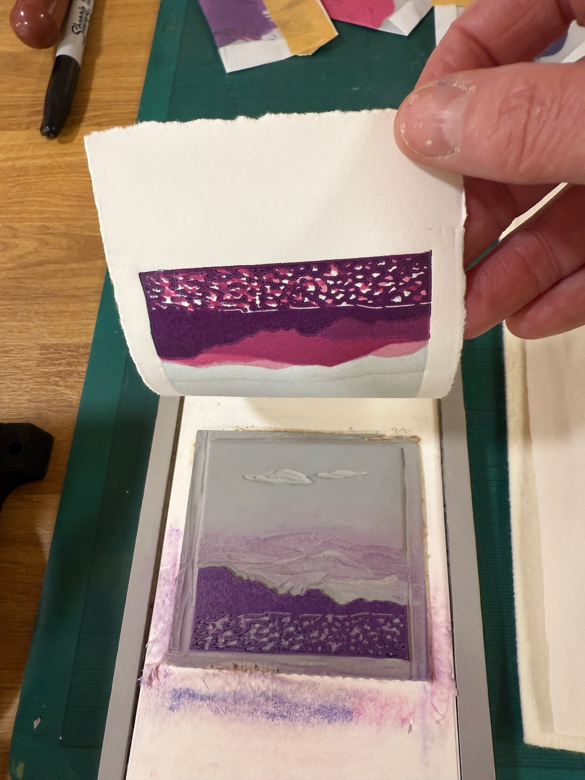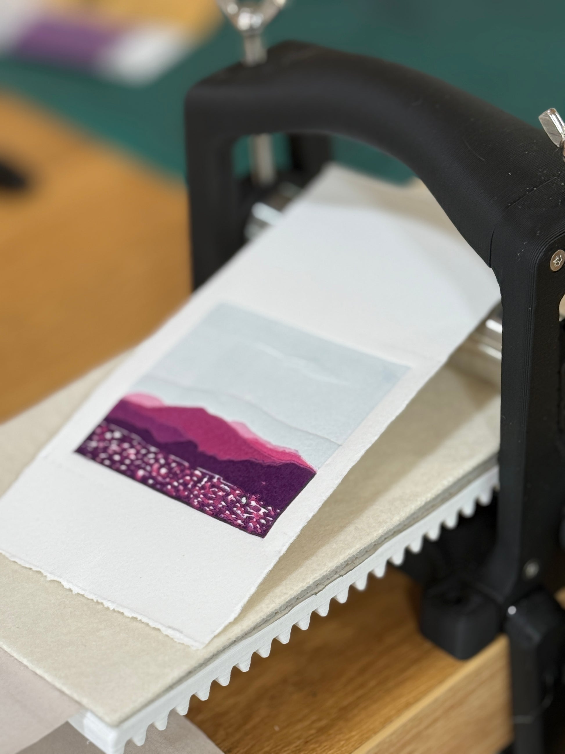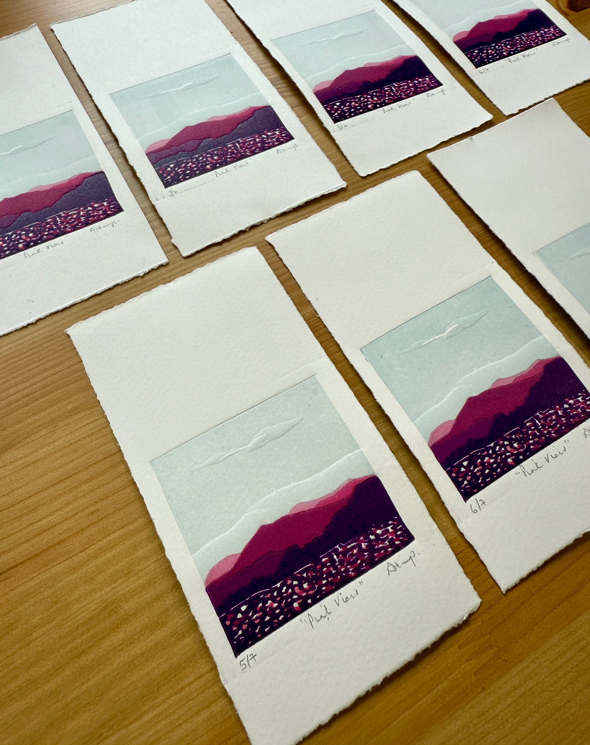 A 6 colour reduction linocut print, printed on Somerset Satin 250gsm printing archival paper. The clouds have an embossed relief detail.